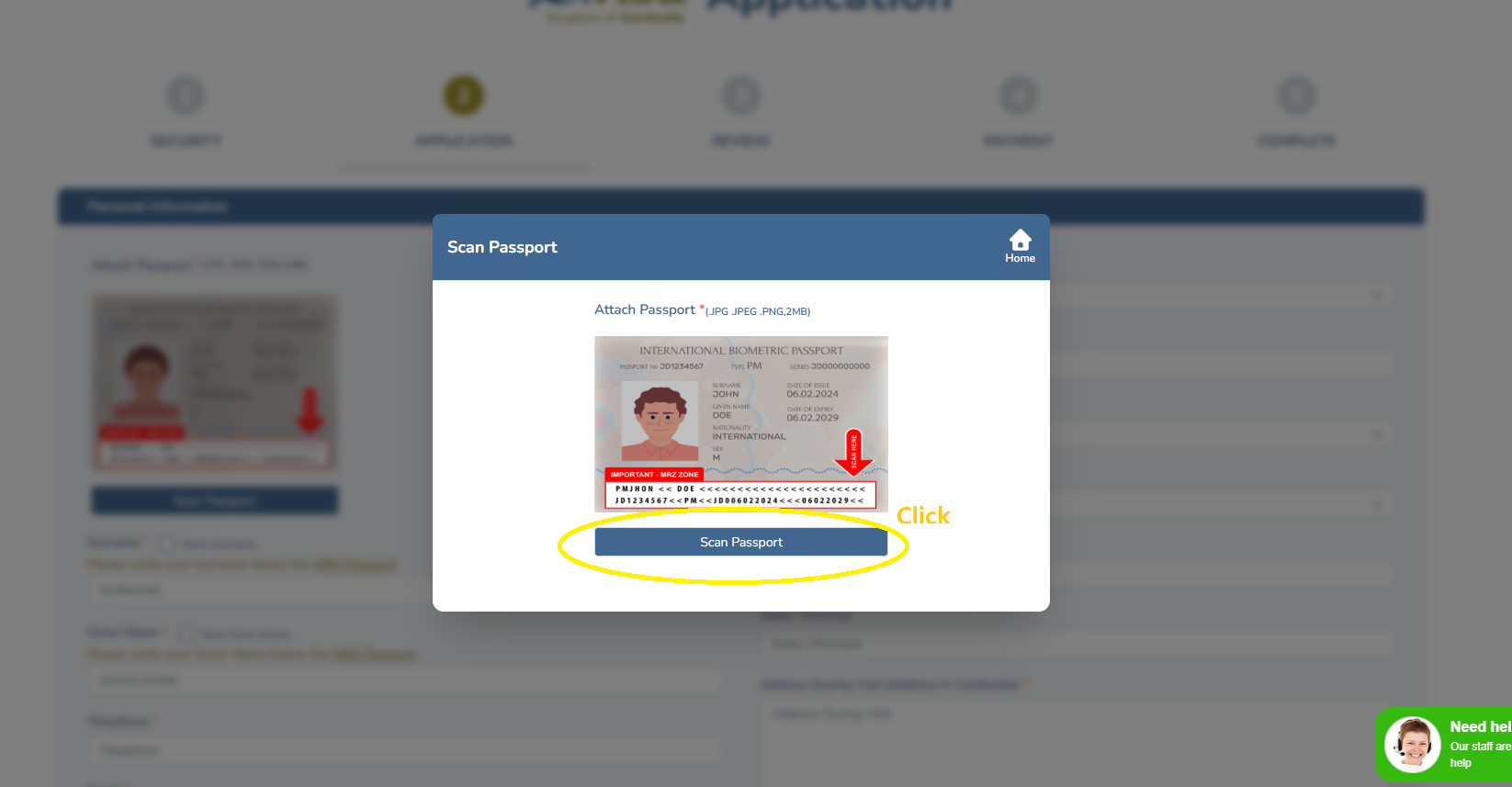 Click Scan Passport and upload your passport scan 📷. The system auto-reads details.
