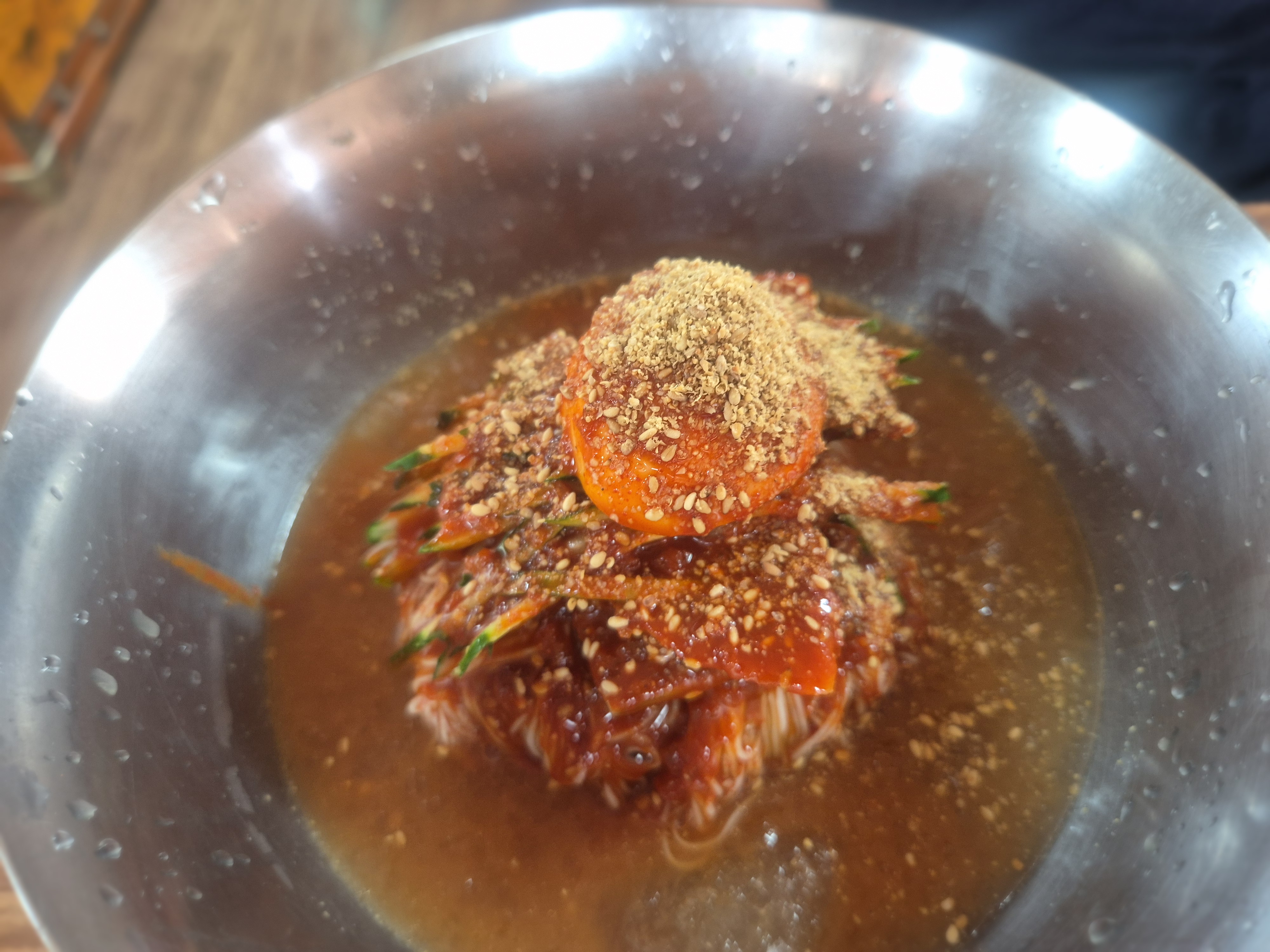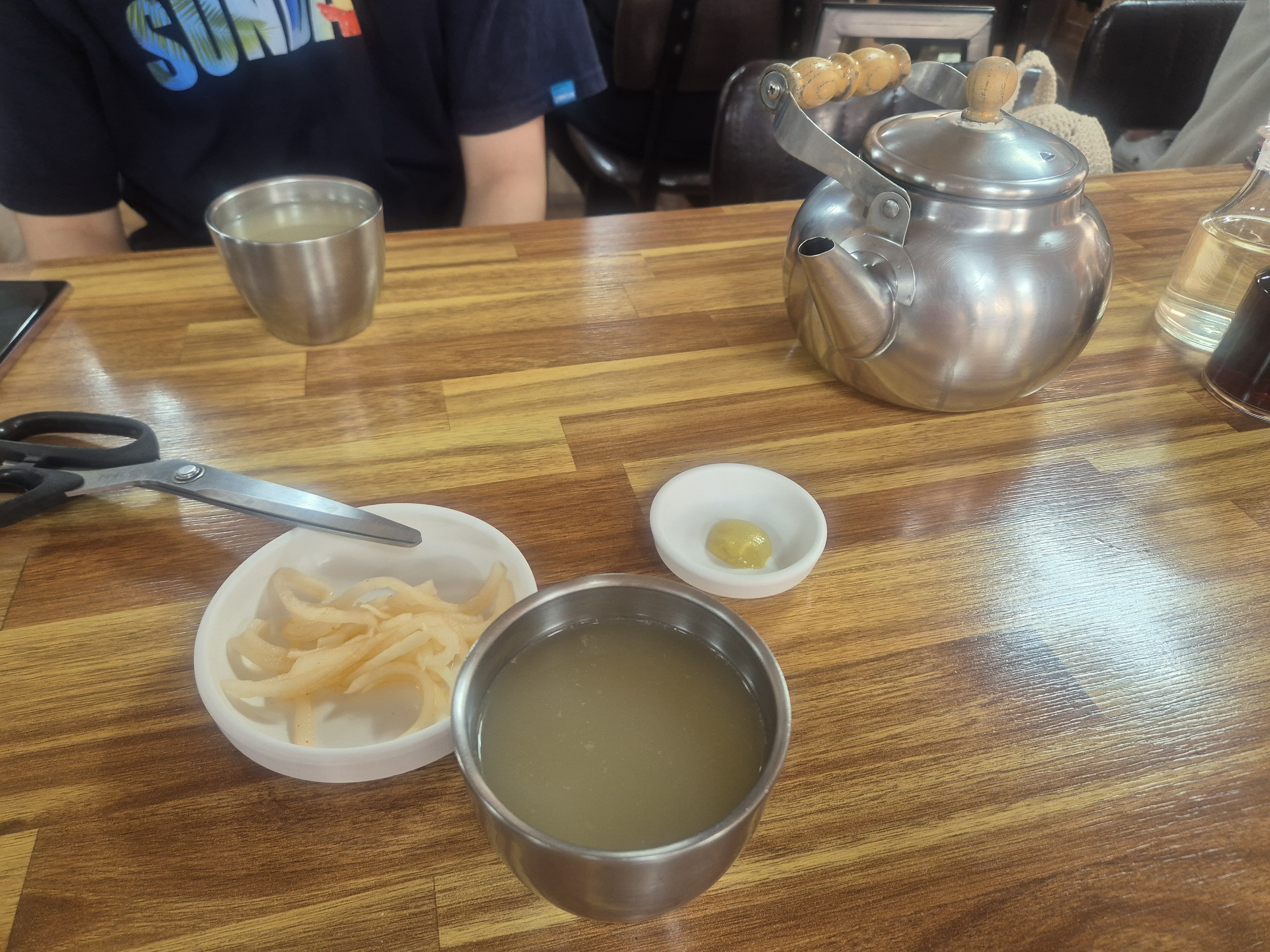 \When I finally sat down, the staff served a kettle of warm broth. Many naengmyeon restaurants in Korea offer broth that tastes heavy or overly salty, but here it was different — light, clean, and refreshing. It reminded me of spring water, the kind you’d want to drink endlessly on a hot day. I refilled my cup several times before the main dishes even arrived.