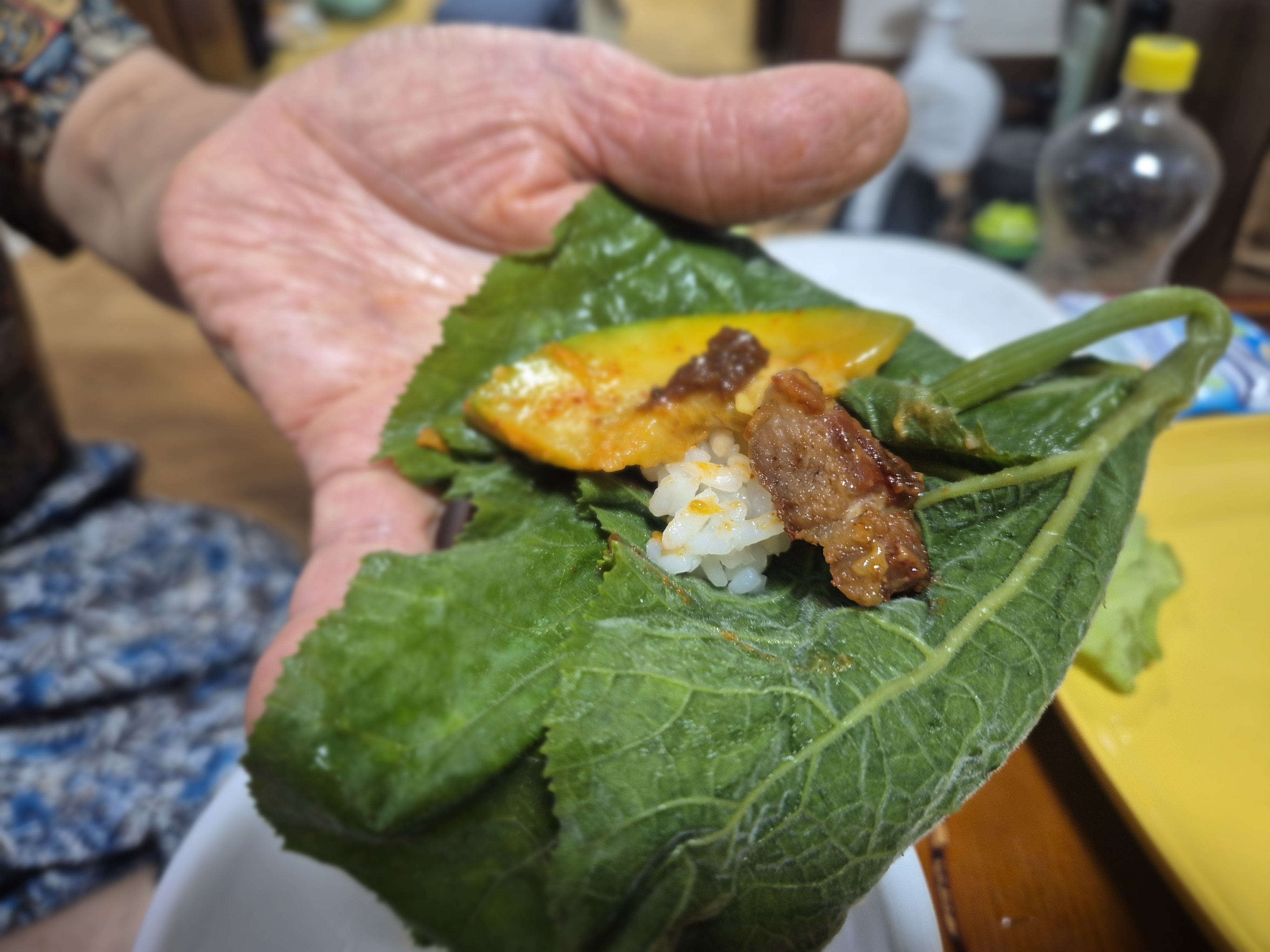 Sharing pumpkin leaf wraps is more than just eating. It reflects the Korean value of togetherness — food prepared by elders, shared at one table, bringing generations closer.