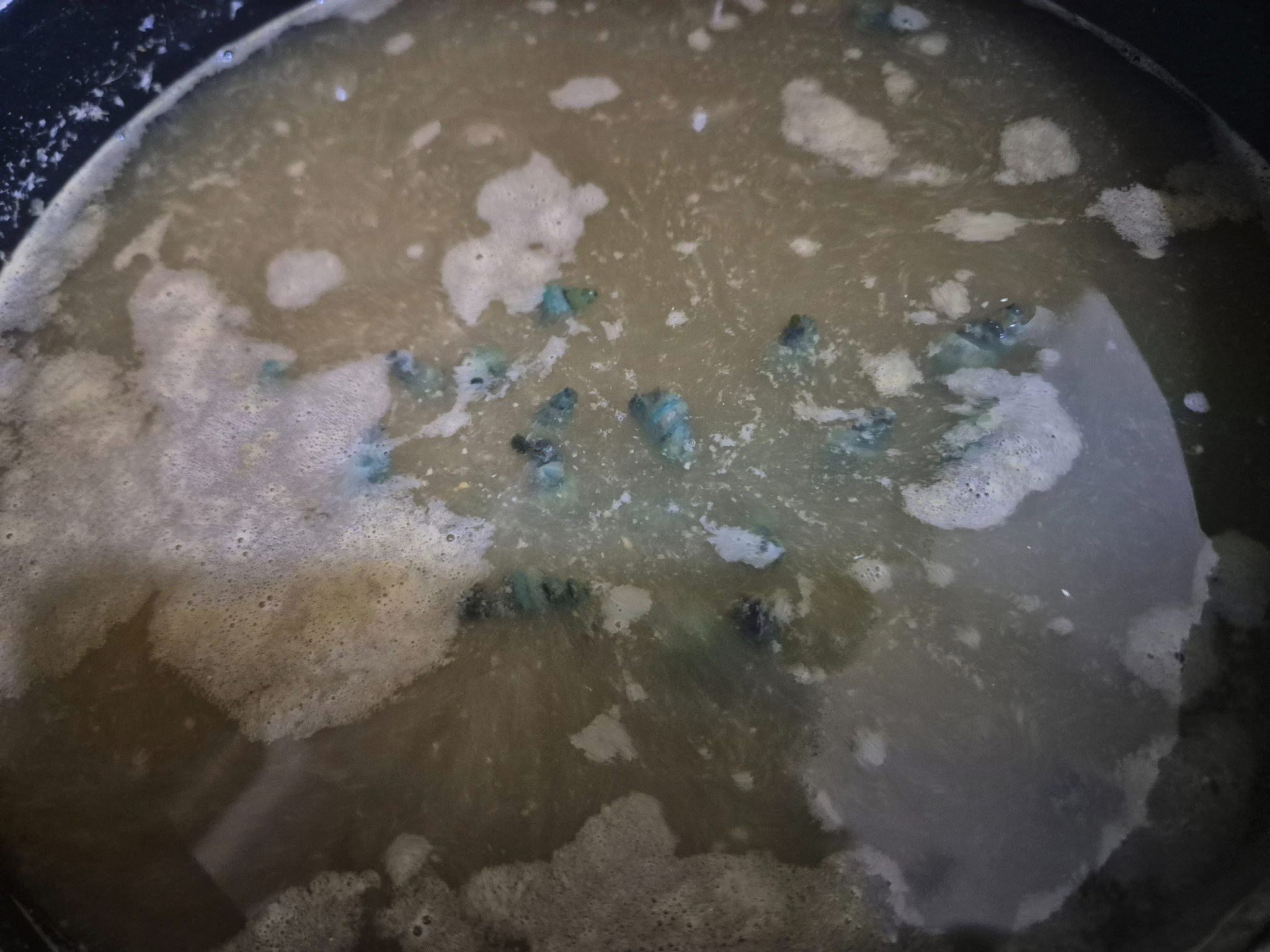 - In a pot, add 7 cups of snail broth and stir in 1 tbsp of soybean paste.
