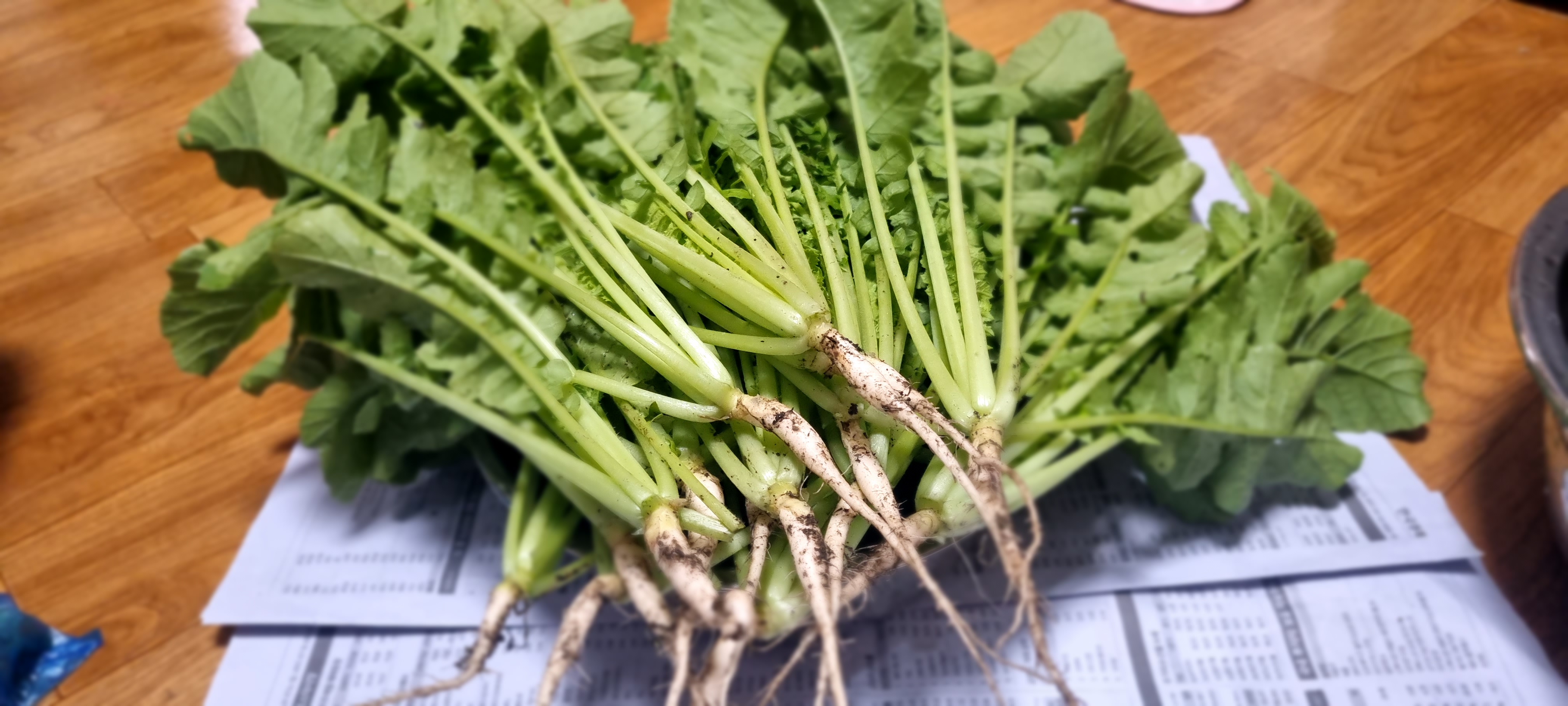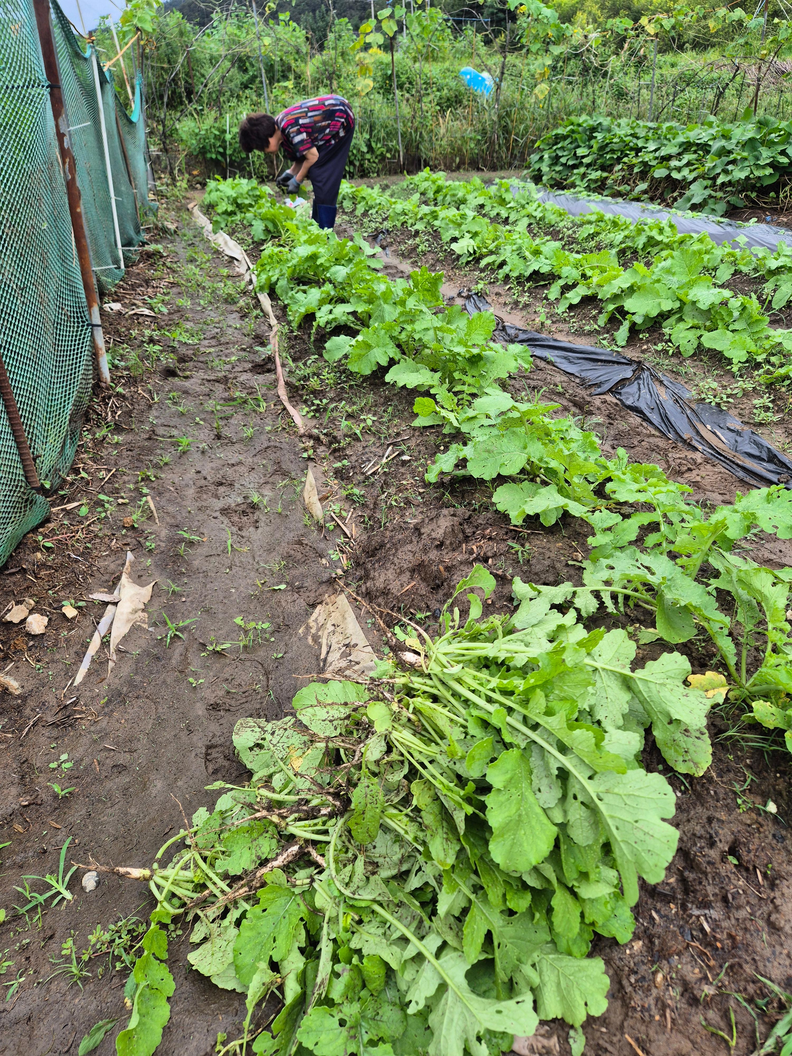 I recently thinned out my radish patch in my countryside garden. The roots were still slim, but the greens were tender and vibrant—perfect for kimchi.