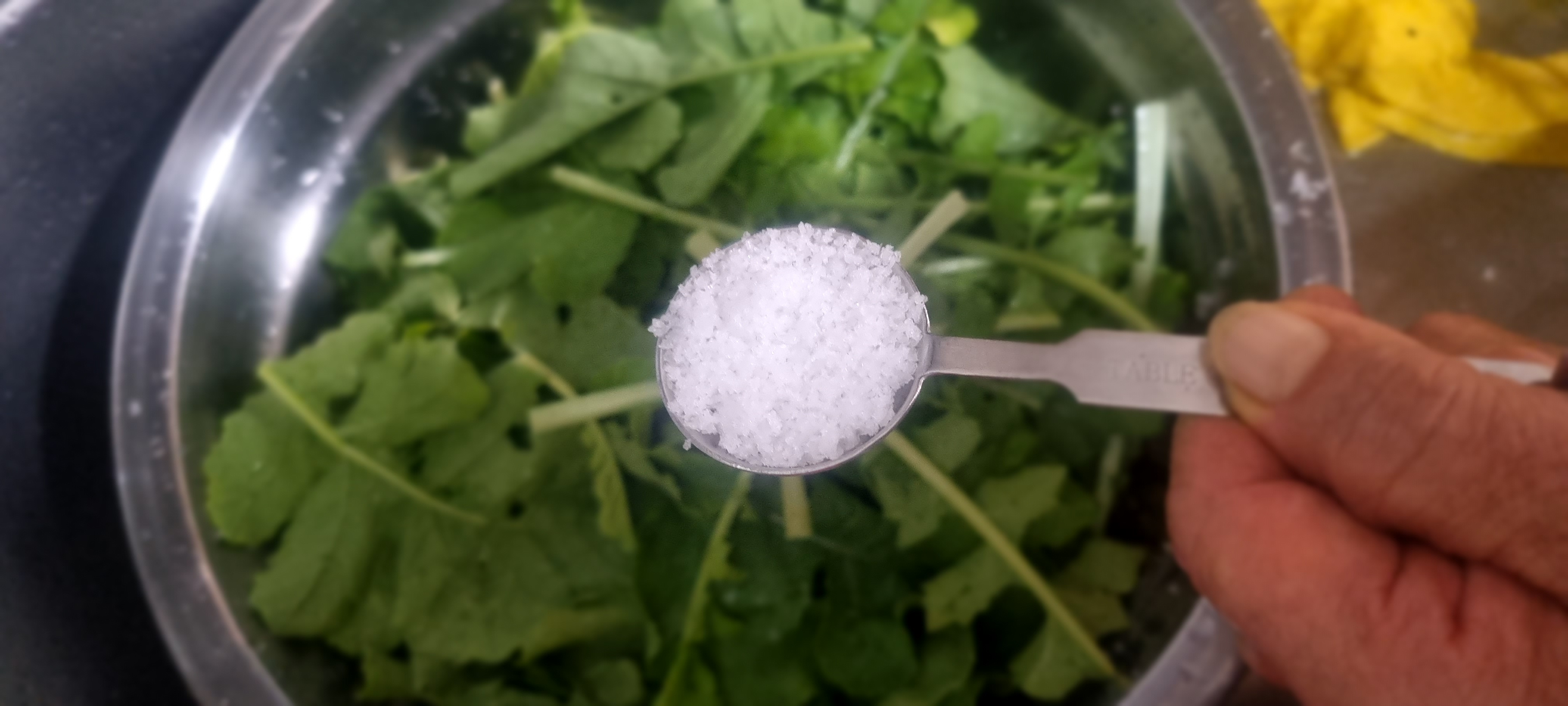 - Mix Together – Coat the greens evenly with the paste, adding green onions and sliced chili.