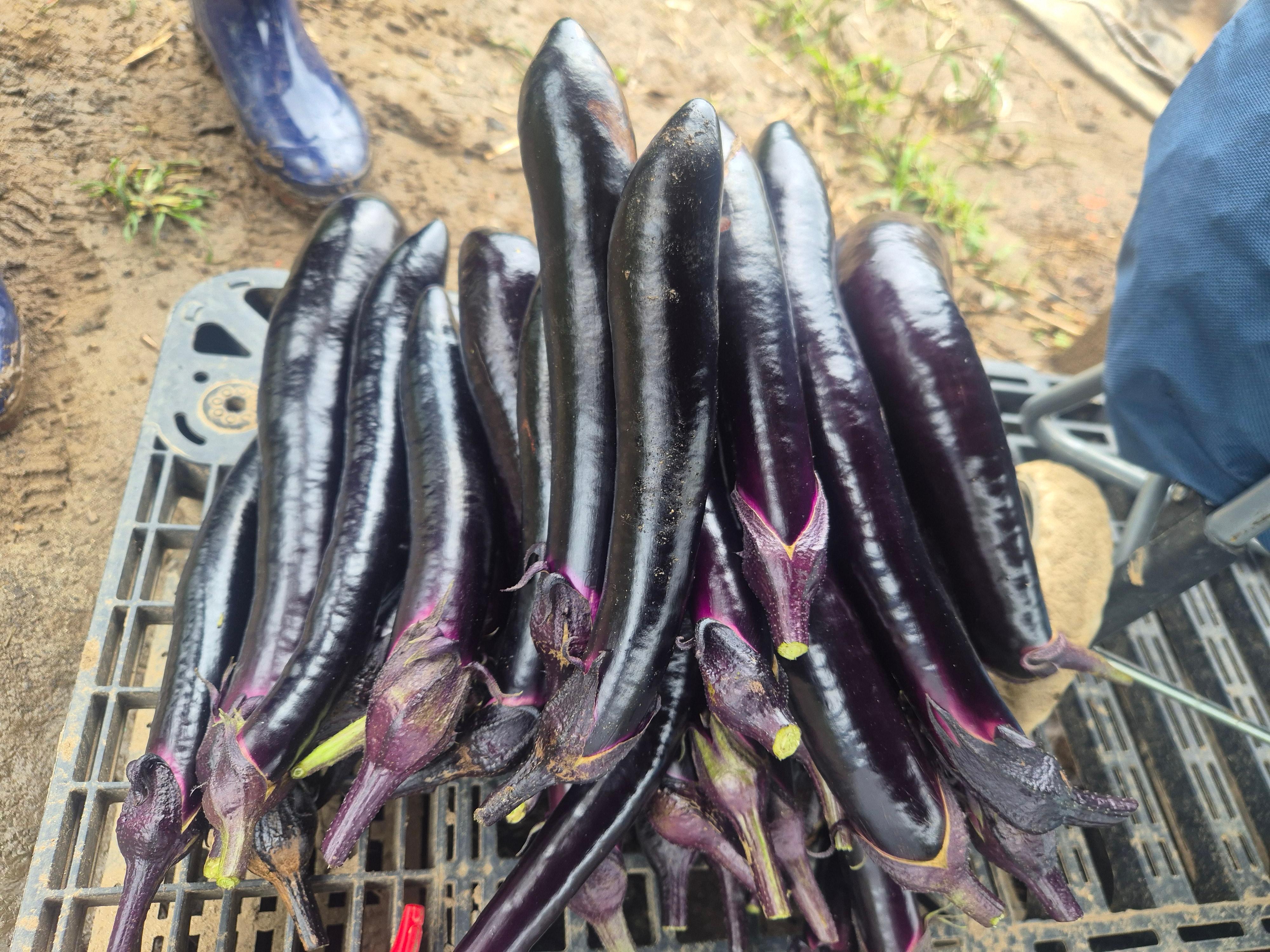 Nearby, eggplants glistened in deep purple, completing this week’s small harvest.