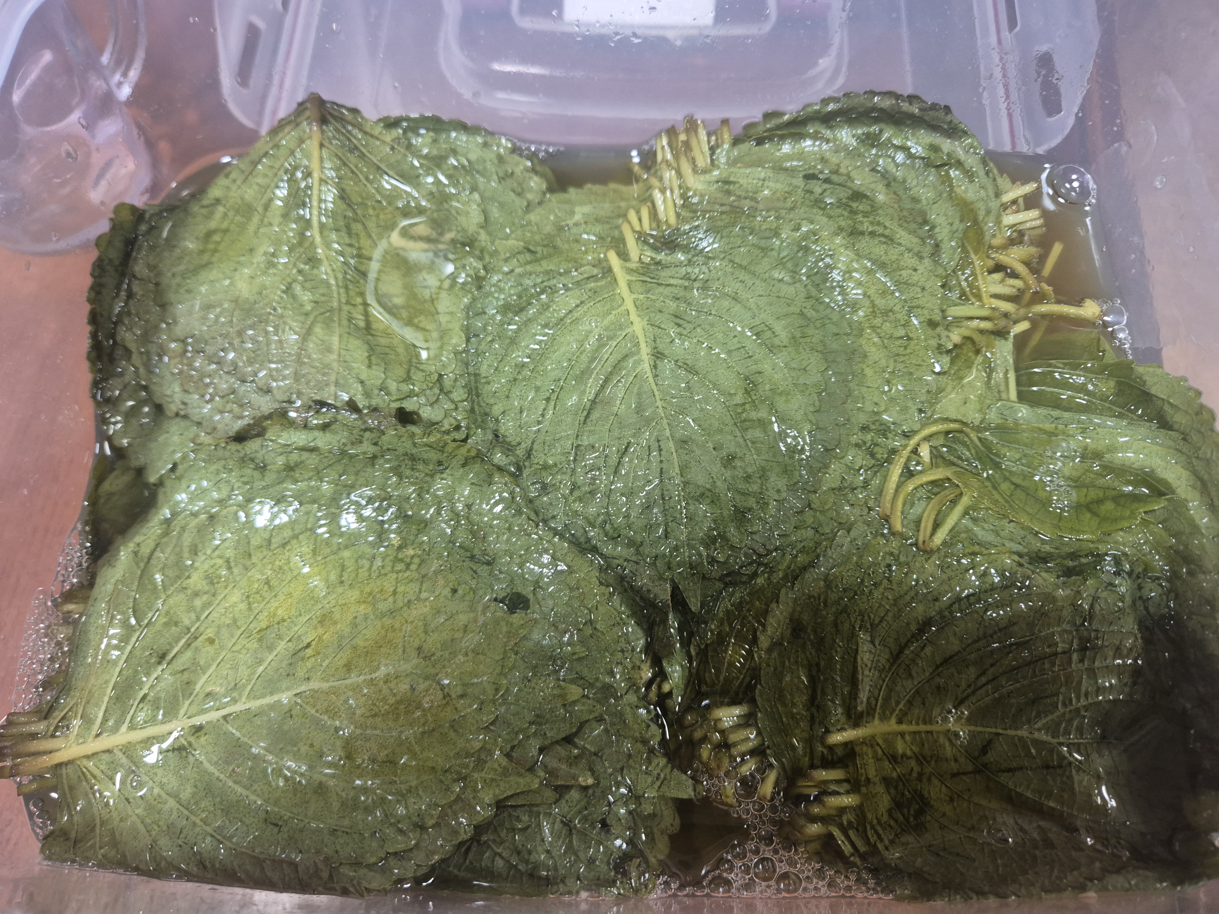 - Soak fresh perilla leaves in saltwater (2 tbsp salt + 1 liter water).