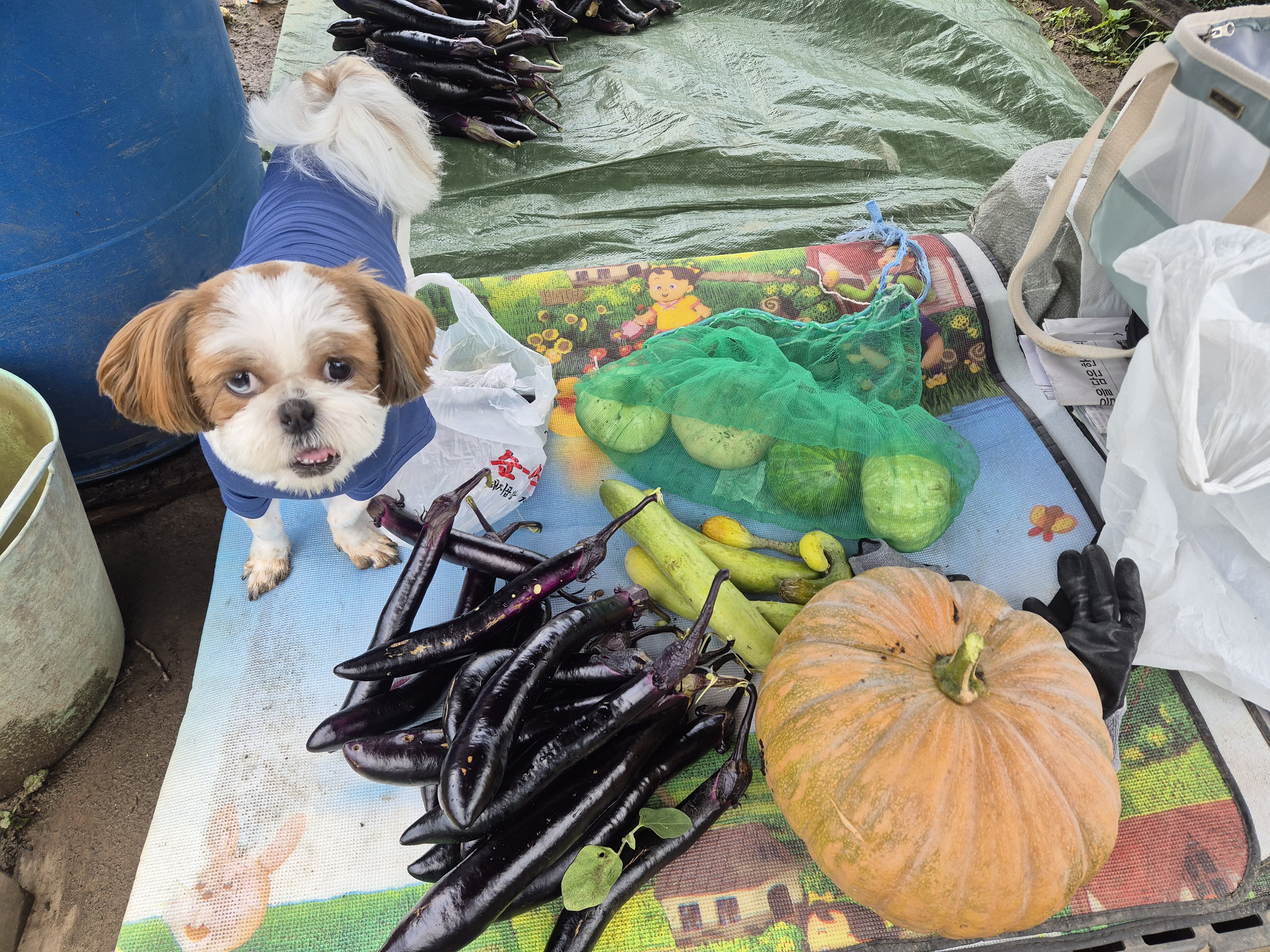 Of course, my little Shih Tzu Creamy trotted along. She wore her tiny blue vest, sniffing and exploring like she was guarding the harvest. These are the small joys of getting older: growing food with my own hands and sharing the day with my dog.